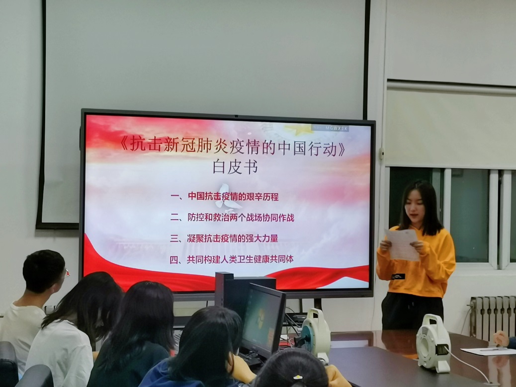 活动开始,由支部第一党小组代表袁金秀和李冬对改革开放四十年来的变化及感受进行展示分享,她们表示作为伴随着改革开放成长起来的一代,要在改革中谋发展,在创新中求进步。之后,第二党小组代表戴一冰和张甜甜进行了优秀党员故事的分享,分享中他们提到,井冈山精神、长征精神、延安精神等共同构成了中国共产党在前进道路上的宝贵精神财富。第三党小组的刘佳佳和张琰对《抗击新冠肺炎疫情的中国行动》白皮书进行了深度解读和分享,从分享中更加深刻地了解到我们是一个命运共同体,更是一个责任共同体。活动最后,侯老师强调,作为大学生党员,我们应该明确自己肩上的责任,必须以更高的标准来要求自己,认真学习优秀党员的先进思想,起好党员的模范带头作用。