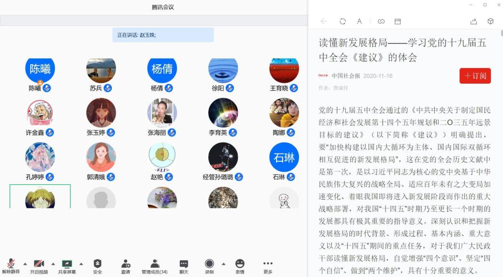 随后,大家认真学习了《中共中央关于制定国民经济和社会发展第十四个规划和二〇三五年远景目标的建议》、《中国共产党第十九届中央委员会第五次全体会议公报》、《中国共产党第十九届中央委员会第五次全体会议文件汇编》、《党的十九届五中全会<建议>学习辅导百问》等重要内容并进行了热烈讨论。