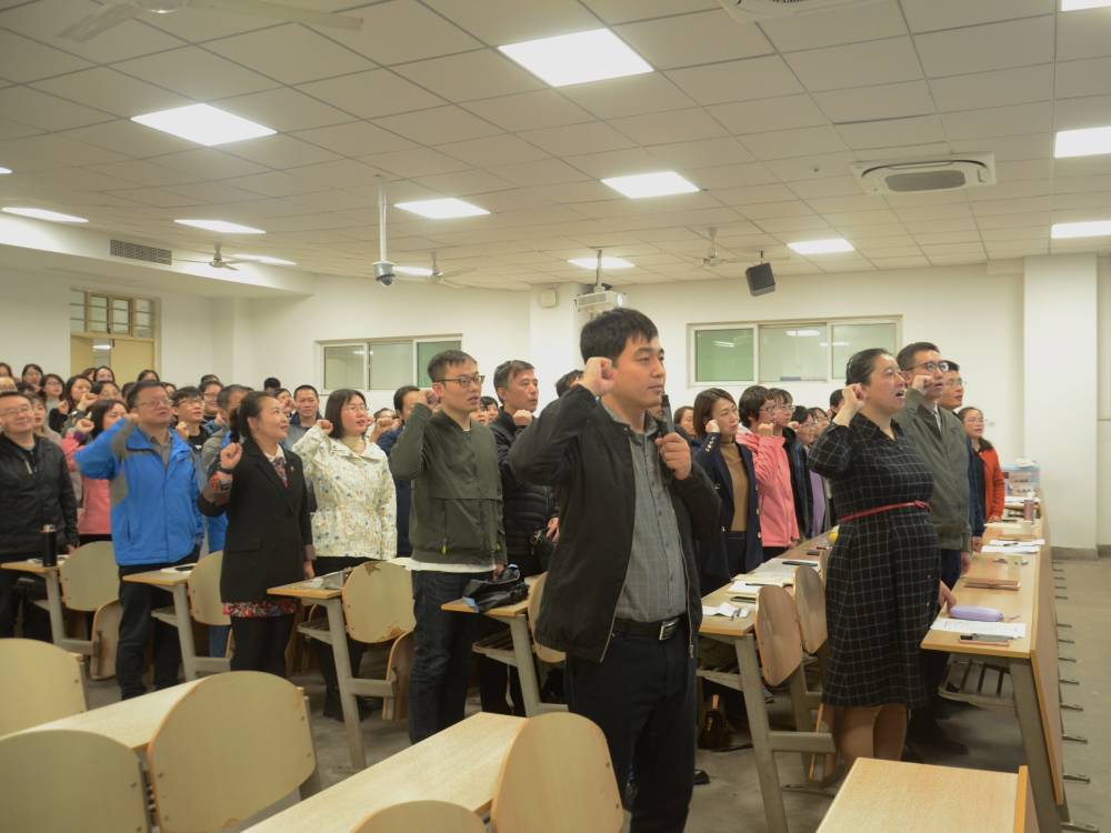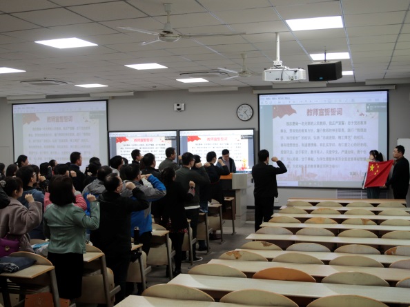会议第一阶段,党委书记、副院长姬浩带领全院教师面对国旗,举起右手庄严宣读教师誓词。宣誓仪式后,全体教师签订了《yl23455永利集团教师承诺书》。