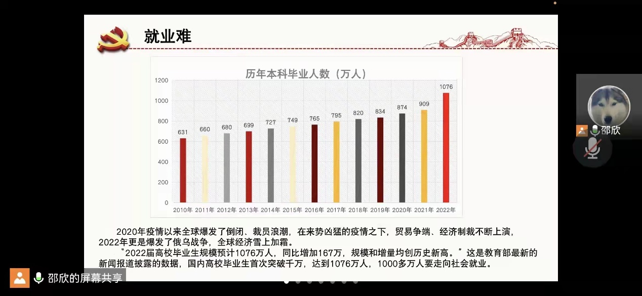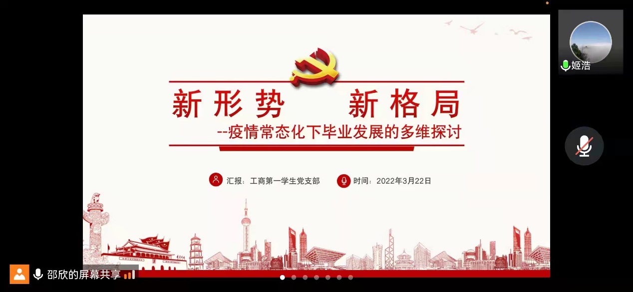 本次会议的主题为“新形势 新格局--疫情常态化下毕业发展的多维探讨”。会议分为三个环节,首先由工商第一学生党支部书记邵欣带领大家共同学习《在中央政协工作会议暨庆祝中国人民政治协商会议成立70周年大会上的讲话》、习近平在中央党校中青年干部培训班开班式上发表的重要讲话、2022全国两会精神三项理论内容。号召学院全体党员以学习贯彻文件精神为契机,通过学习相关文件找准新形势下学生毕业选择的出发点、切入点与落脚点。并结合当下学生毕业发展突出问题与相关数据,探讨新形势下学生毕业选择。