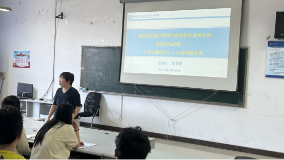 为深入开展学习贯彻习近平新时代中国特色社会主义思想主题教育,落实党的二十大实施就业优先战略、强化就业优先政策,提高全体党员的党性修养,6月25日,yl23455永利集团党委副书记王育晓为学院学生党员讲授题为“坚持在发展中保障和改善民生就要实施就业优先战略——学习贯彻党的二十大精神”的专题党课。学院70余名学生党员参加。