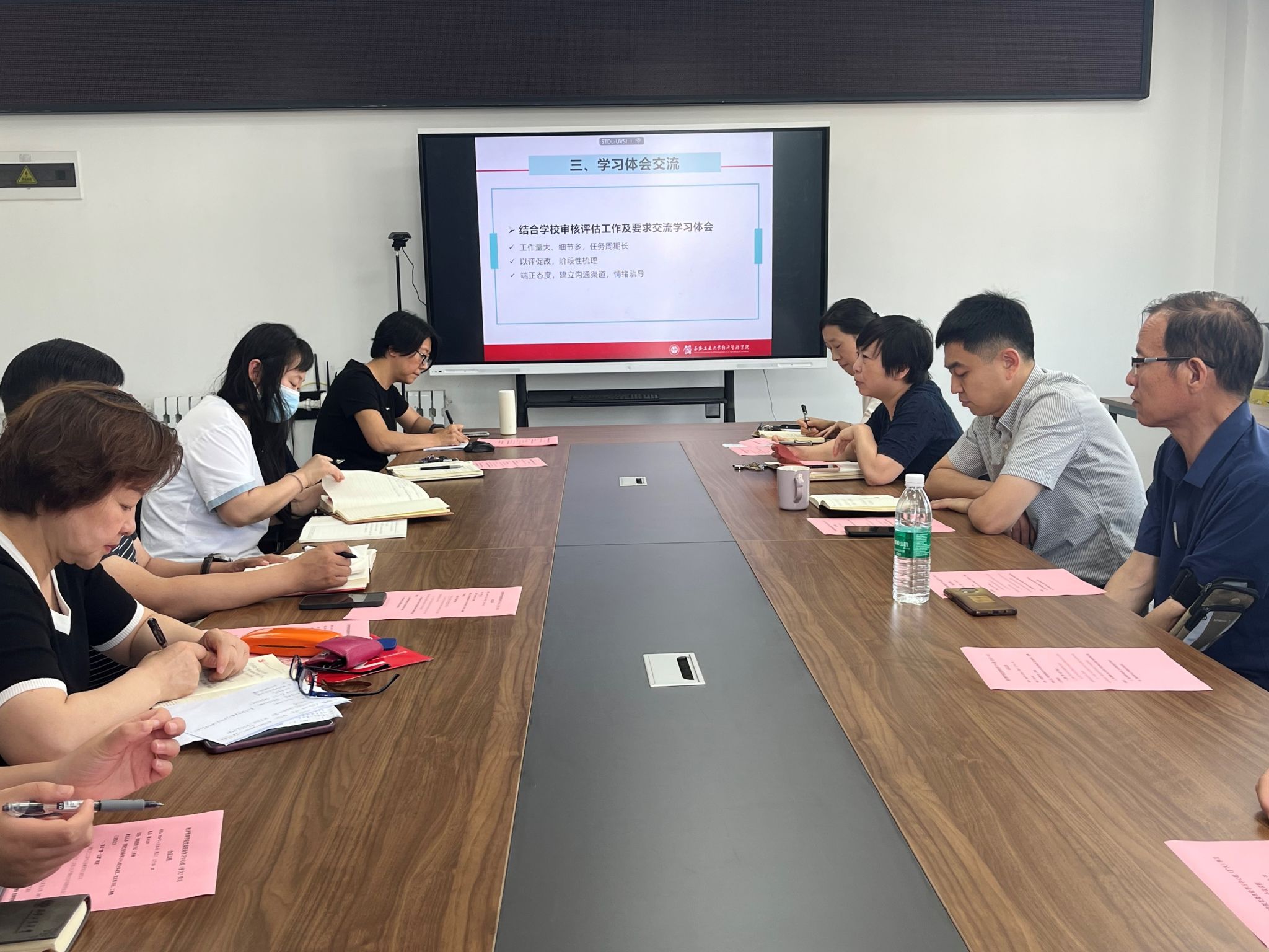 学习会严格落实“第一议题制度”,工商教工党支部书记陈曦带领大家共同学习习近平总书记在学习贯彻习近平新时代中国特色社会主义思想主题教育总结会议上的讲话,以及《求是》杂志发表的习近平总书记重要文章《铸牢中华民族共同体意识 推进新时代党的民族工作高质量发展》。会议第二阶段,集体学习了新修订的《中国共产党纪律处分条例》,深刻认识新修订《条例》与时俱进的鲜明特征和重大意义。接下来,各位参会党员结合学校审核评估工作进行交流学习体会。最后,王育晓对本次会议进行了总结。