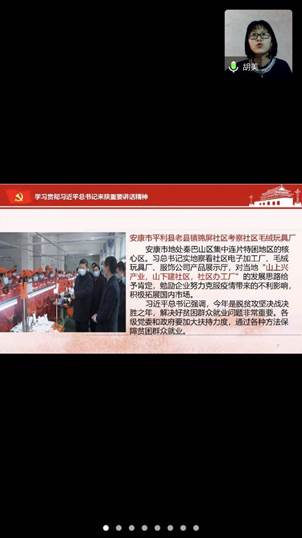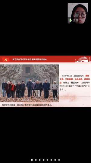 胡美同学就“国之命脉:力保产业链供应链稳定”专题进行汇报讲演,内容围绕“制造业是国家经济命脉所系,国有大型企业发挥主力军作用”和“围绕产业链部署创新链,创新链部署产业链”,以习近平总书记考察陕西汽车控股集团有限公司、柞水县小岭镇金米村和平利县老县镇蒋家坪村女娲凤凰茶业现代示范园区为例,进一步说明在疫情影响下,陕西如何全面建成小康社会,告诫领导干部要站在讲政治的高度把发展经济与生态环境建设作为重要工作摆在首要位置,保持坚如磐石的信心、只争朝夕的劲头、坚韧不拔的毅力,夺得脱贫攻坚新战绩。王洁同学就“国之学脉:胸怀大局,无问西东”专题进行汇报讲演,以习近平总书记考察西安交通大学大力弘扬“西迁精神”为题, 鼓励我们当代大学生应继承和发扬“西迁精神”,将“西迁精神”贯穿我们整个人生规划当中,树立祖国大我、个人小我的价值观念。不怕吃苦,努力学习,刻苦钻研,敢于向困难挑战,不断提升个人素养和综合能力,积蓄力量,随时准备前往祖国最需要的地方。李毛同学以“国之文脉:夜未央回长安”为专题进行汇报讲演,带领支部成员从汇报内容中了解到习近平总书记要求在科学防控疫情的前提下,有序推动各类商场、市场复商复市,恢复正常生活秩序。加大文物保护力度,弘扬中华优秀传统文化。
