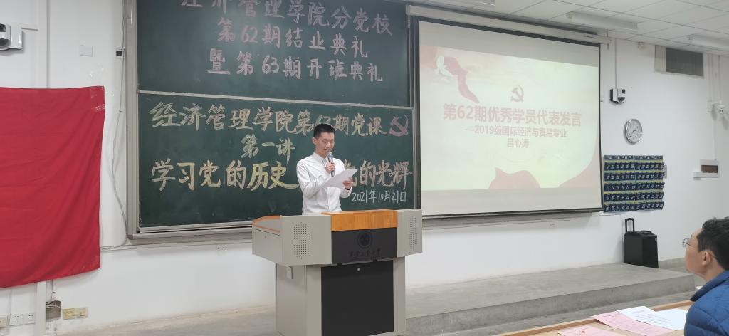 工商第三学生党支部书记侯剑波宣布优秀学员名单,并由王守民老师和姬浩老师为第62期党课优秀学员颁奖并合影留念。第62期优秀学员代表吕心涛同学上台发表,她希望在场学员勇担时代赋予青年人的使命与责任,从思想和行动上都积极向党组织靠拢,争取早日加入中国共产党。