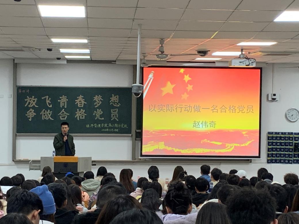 本次授课,赵伟奇老师以“放飞青春梦想,争做合格党员”为主题,分别围绕树立正确的入党动机、自觉接受组织的培养、教育和考察、严格遵守入党程序以及以实际行动争做合格党员四个板块进行讲解。其中,赵老师着重强调树立正确的入党动机即实现共产主义理想、献身共产主义伟大事业、全心全意为人民服务是保证党的纯洁性以及组织战斗力的重要因素。作为积极向党组织靠拢的青年大学生,更要将正确入党动机置于前列。最后,赵老师提到发展党员的基本程序是一个严谨漫长的过程,各个学员应积极主动接受组织的培养、教育和考察,实事求是的汇报自身思想、工作、学习等方面的情况,虚心听取党组织的意见和要求,争取早日成为一名合格的共产党员!