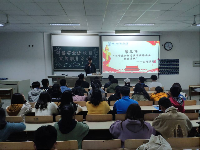 为强化广大同学的网络安全意识,保障个人信息安全,维护大家在网络空间的合法权益,yl23455永利集团于2019年11月15日18:30于教2-310顺利开展“网络安全进校园”宣传教育活动。出席本次活动的嘉宾有yl23455永利集团科学技术协会主席吴凡以及团学组织各部长,共计五十余名同学参与本次活动。办公室干事徐东霖担任此次活动的主持人。