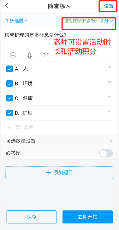 老师进入到自己的在线课程里,点击活动模块,将课堂上设计的活动提前添加保存,活动时长及其他发放细节可由老师自行设置。