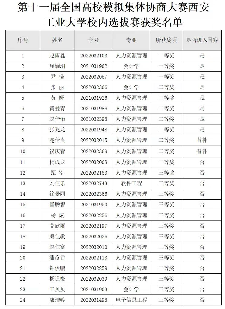 第十一届全国高校模拟集体协商大赛校内选拔赛决赛于2023年9月8日晚举行。两组选手都有着十分优异的表现,其中赵雨鑫等3人获得一等奖,张丽等7位同学获得二等奖,杨成龙等14名同学获得三等奖。