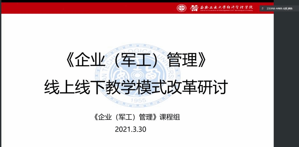 本次研讨会主要分为四部分。首先,经管学院教学副院长向海燕教授说明《企业(军工)管理》课程开展教学改革的重要性和必要性。其次,经管学院本科教学督导组三位专家对本课程网上巡课的情况进行说明,提出了课堂四率、教师主动管理和互动、课程吸引力、考核方式等方面存在的问题并分析了原因,从课程内容、课程体系、分模块教学、线上线下混合教学模式、考核方式、教研团队建设、军工知识融入等方面提出建议和意见。第三,课程组部分教师从军工知识运用与融合、互动教学模式、粗案例讨论、课程思政等方面的分享了自己的成功经验,对如何开展课堂教学改革谈了自己的看法。最后,由课程组组长曹丽老师从线上线下知识点构建、分专业分模块设置课程及军工知识融入等方面提出了课程改革思路,初步规划从教学大纲、教学体系重构、线上教学知识点及资料收集、案例集、教材、习题库和试题库等方面后续逐步展开改革。