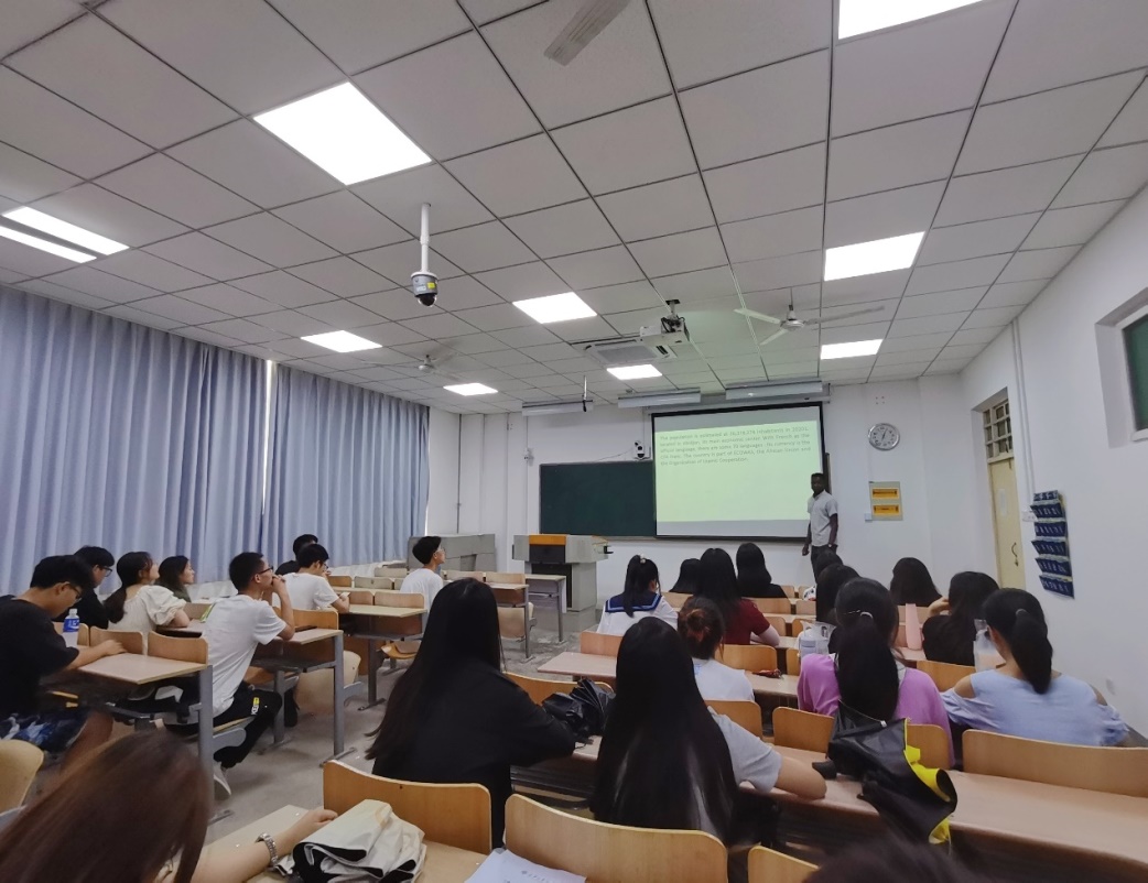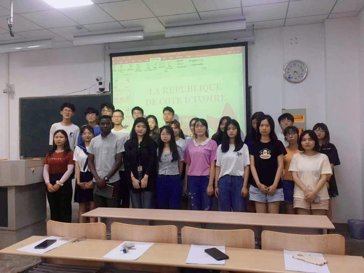 本次活动由夏维婷主持,共分为三个环节。首先,由国际教育学院SIB SANSAN MONE介绍他的家乡——科特迪瓦共和国的经济、政治、文化,使同学们对于“西非明珠”科特迪瓦这个国家有了更深入的了解。随后,19级国际班闫思纯和20级国际班尹昊同学分别进行了以电子商务对中国对外贸易的影响、社交媒体焦虑为主题的英文演讲,收获了全场同学的赞扬与热烈掌声。最后,20级国际班班长尹昊为留学生赠送了写有国际班学生签名和鼓励祝福语的笔记本,并合影留念。