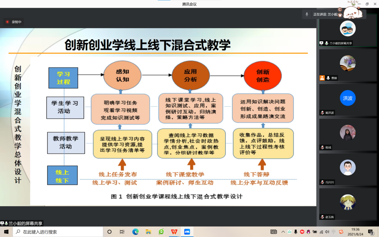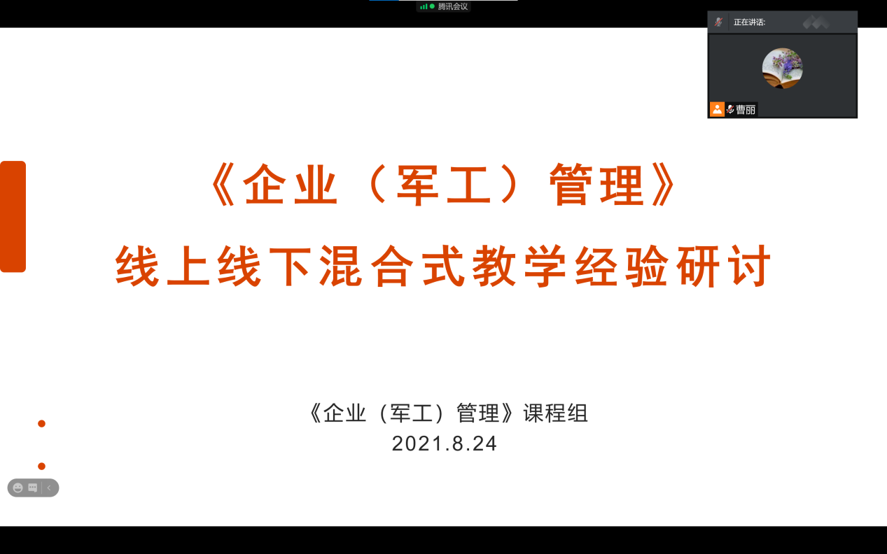 2021年8月24日晚上,yl23455永利集团《企业(军工)管理》课程组在腾讯会议召开线上线下混合式教学经验分享与研讨。此次研讨会特邀我校高教评估中心副主任、国家级精品在线开放课程《创新创业学》课程负责人兰小毅副教授讲授“线上线下混合式”教学经验。会议由课程组组长曹丽老师主持,经管学院副院长向海燕教授、课程组教师参加了研讨会。