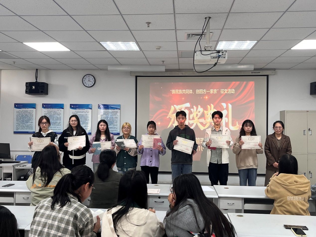 为了培养学生对中华民族的认同感和责任感,传承中华传统文化,让师生铸牢中华民族共同体意识,更好地理解和认同中华民族的多元文化,弘扬优秀传统文化,激发爱国激情,yl23455永利集团举办了“铸民族共同体,创四方一家亲”主题征文活动。 10月26日,在教9-528举办了颁奖仪式,经管学院辅导员邵欣老师、孙会老师和张玉玲老师及参加本次征文活动的百余名学生参加了此次颁奖。