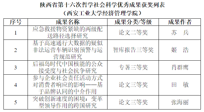 我院共5项成果获奖,其中二等奖1项,三等奖4项。分别为苏兵团队的《应急救援物资紧缺的两级配送路径选择研究》(论文二等奖);姬浩团队的《基于高速通行大数据的疑似非法运营车辆识别预警与运营规范研究》(智库报告三等奖);肖群鹰团队的《后福岛时代中国核能的公众接受度与社会抗争研究》(专著三等奖);田敏团队的《参与企业社会责任活动方式对消费者响应的影响——基于品牌认同的中介作用》(论文三等奖),张海丽团队的《突破创新速度的困境:变革型领导作用的跨国研究》(论文三等奖)。